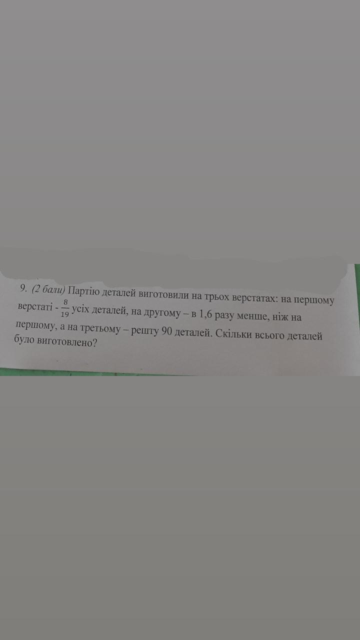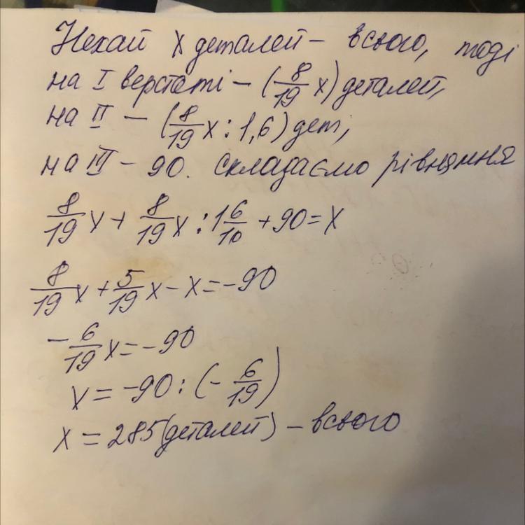 партію деталей виготовили на трьох верстатах: на першому верстаті -8/9 усіх деталей, на другому- в 1,6 разу менше, ніж на першому, а на третьому- решту 90 деталей. Скільки всього деталей було виготовлено? Якщо щось незрозуміло прикріпляю фото