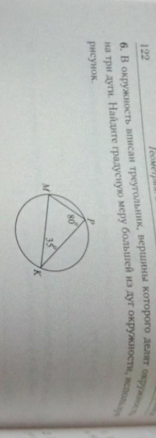 Больший угол треугольника опирается на большую дугу. Здесь больший угол это угол Р, он опирается на дугу МК.