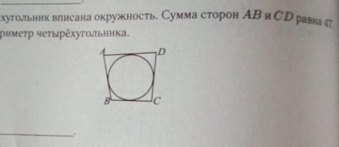 В четырёхугольник вписана окружность. Сумма сторон AB и CD равна 47. Найдите периметр четырехугольника