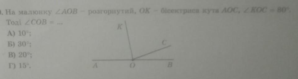 Т.к ОК биссектриса угла АОС. Значит АОС 160. СОВ смежный с АОС, СОВ = 180-160 = 20