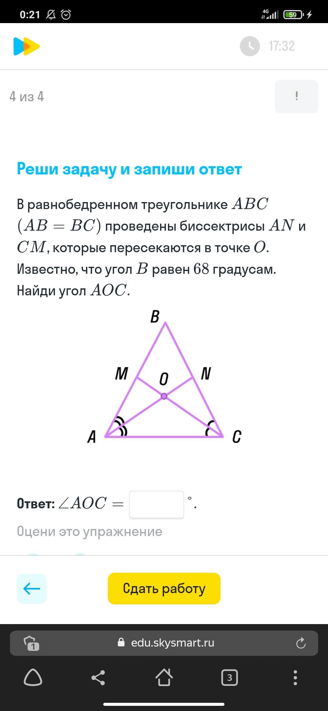 т.к. AN и MC - биссектрисы, то ∠АОС + ∠МСА = 1/2(∠А + ∠С); ∠A = ∠C