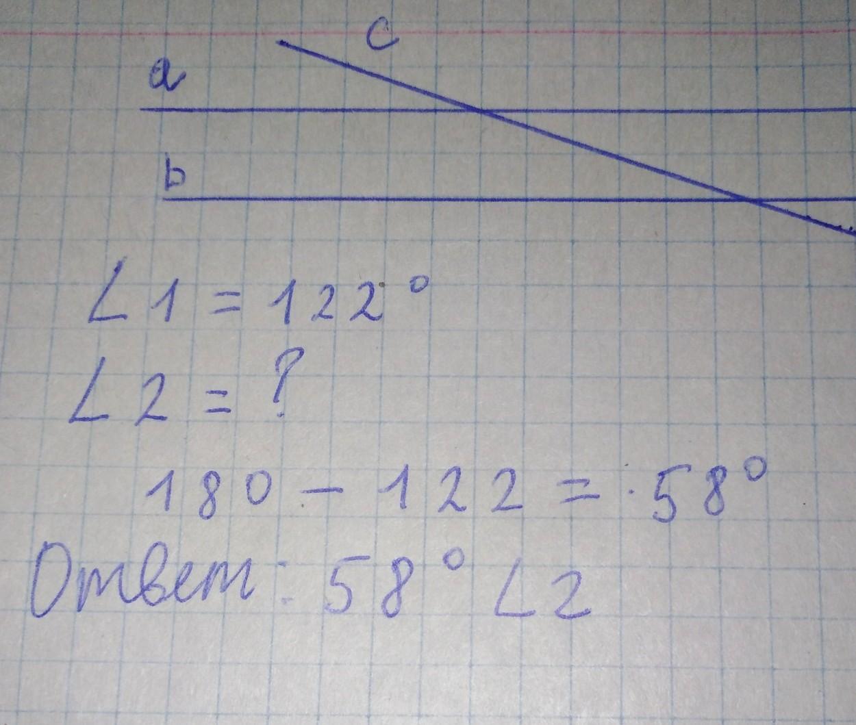 параллельные прямые a и b пересечены секущей c найдите угол 2 если угол 1 равен 122 градуса срочно пожалуйста