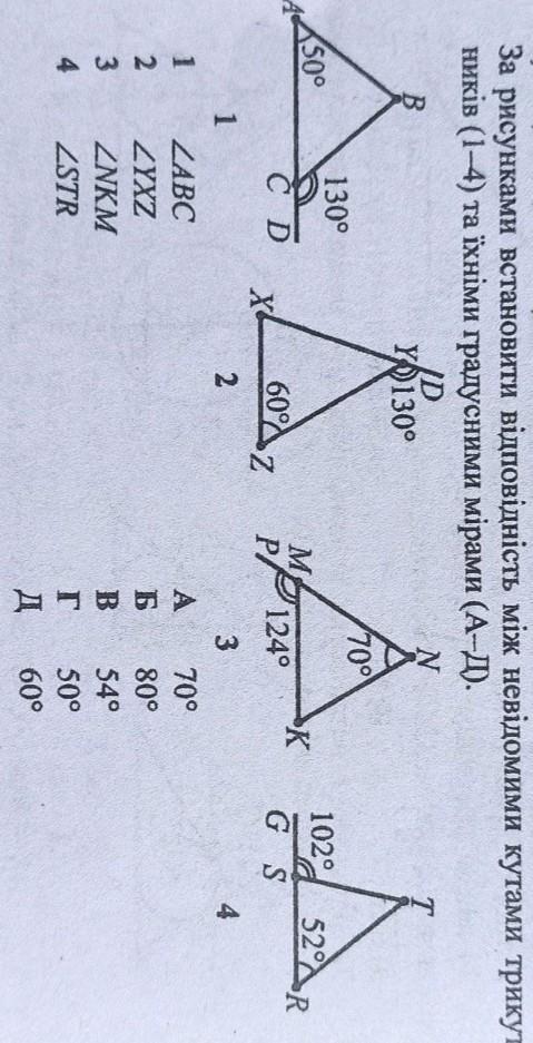 Сначала находятся смежные углы ( внутренний и внешние углы треугольника)