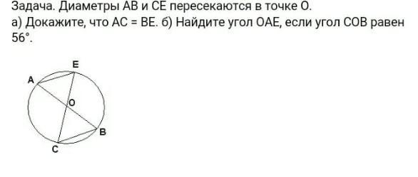 а) АО=ОЕ=ОС=ОВ-радиусы, а радиусы окружности равны. Угол АОЕ=углу СОВ, так как вертикальные углы. Отсюда следует, что треугольники АОЕ и СОВ равны. Проведём ЕВ и АС, и у нас получиться прямоугольник и ЕС и АВ будут диагонали, а в прямоугольнике противоположные стороны равны. Отсюда следует, что ВЕ=АС.