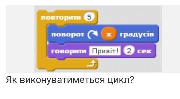 Від буде поводити себе так: спочатку виконавець буде повертатися за годинниковою стрілкою на вказане число (x) і буде говорити "Привіт!" 2 секунди. До того ж , він буде повторюватися 5 разів.