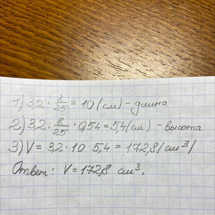 ПОМОГИТЕ СРОЧНО ширина прямоугольного паралелелипипеда равна 3,2 см, что составляет 8/25 его длины, а высота составляет 54% длины. вычислите обьем паралелепипеда.