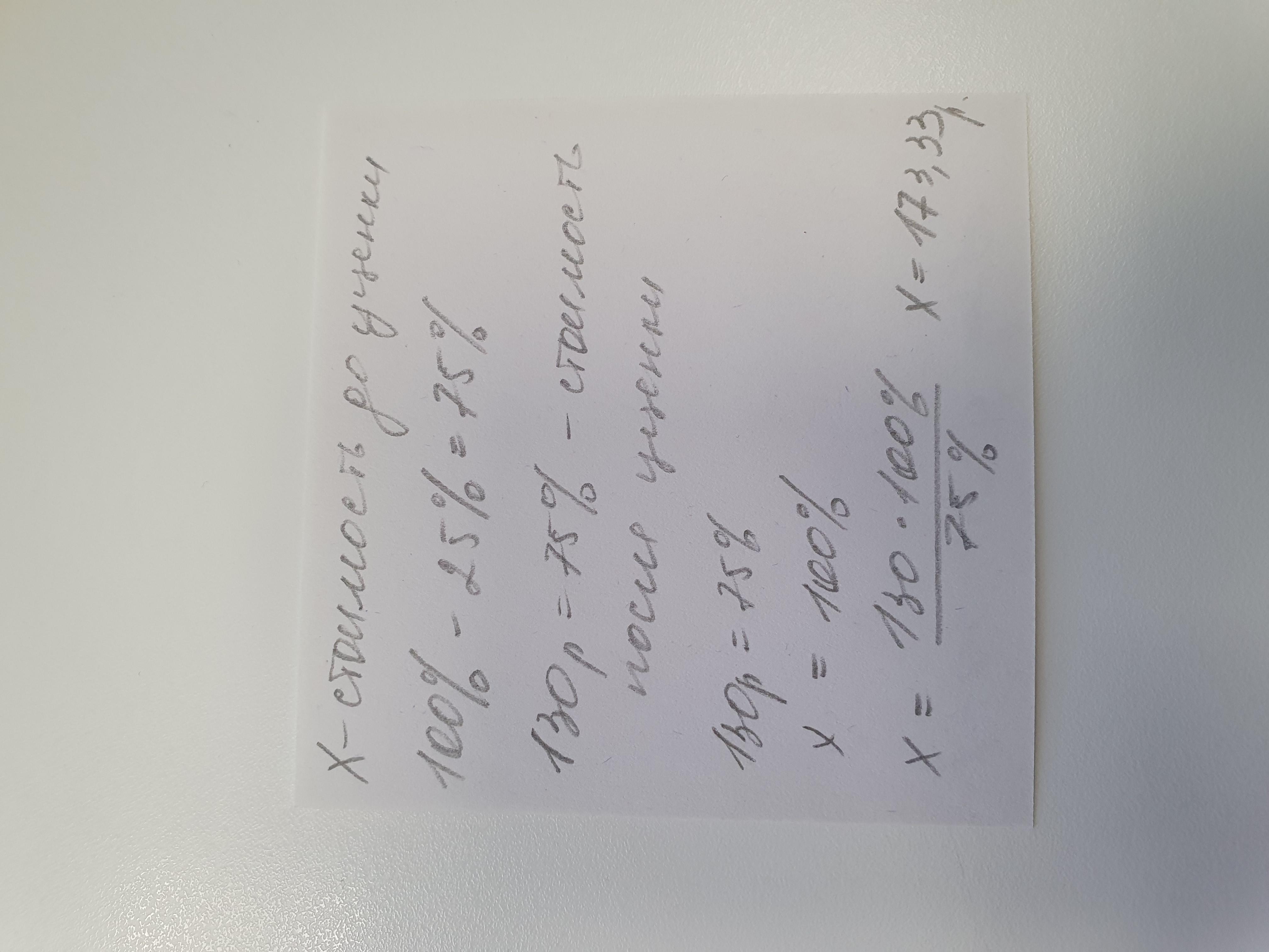 Товар на распродаже уценили на 25%, при этом он стал стоить 130 р. Сколько рублей стоил товар до распродажи?