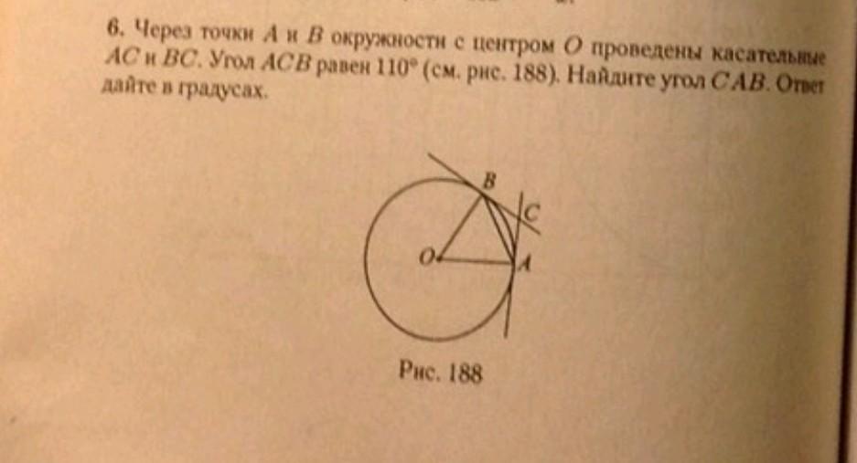 Касательные к окружности равны. Значит, ВС=СА, отсюда следует, что ВСА-равнобедренный. Угол АСВ при вершине равен 110°. Сумма углов при основании равна 70°. Углы при основании равны, отсюда следует, что: