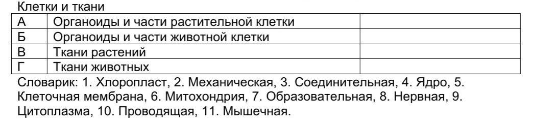 Заполните таблицу, используя соответствующие номера слов из словарика. Понятия в некоторых графах могут повторяться