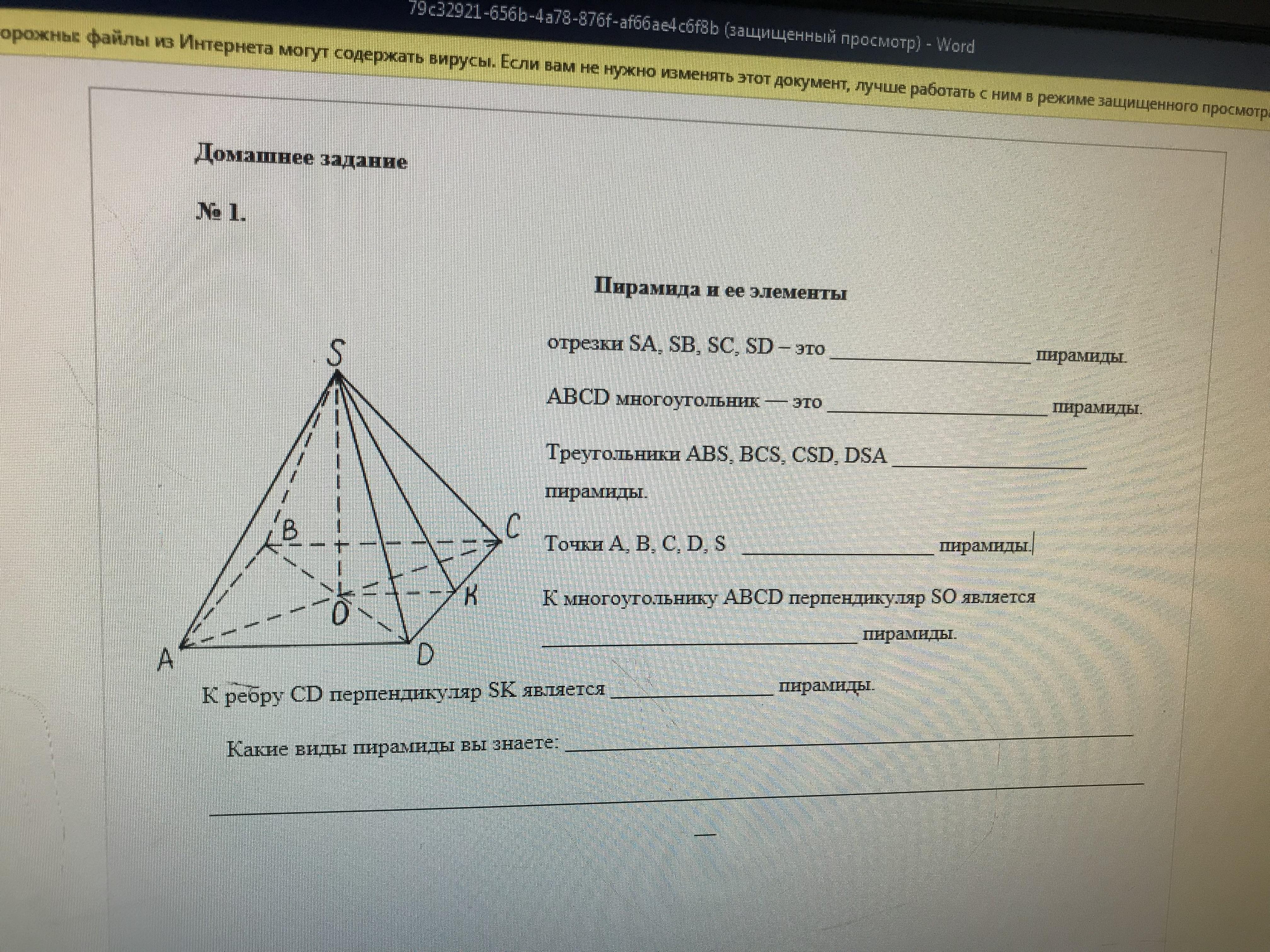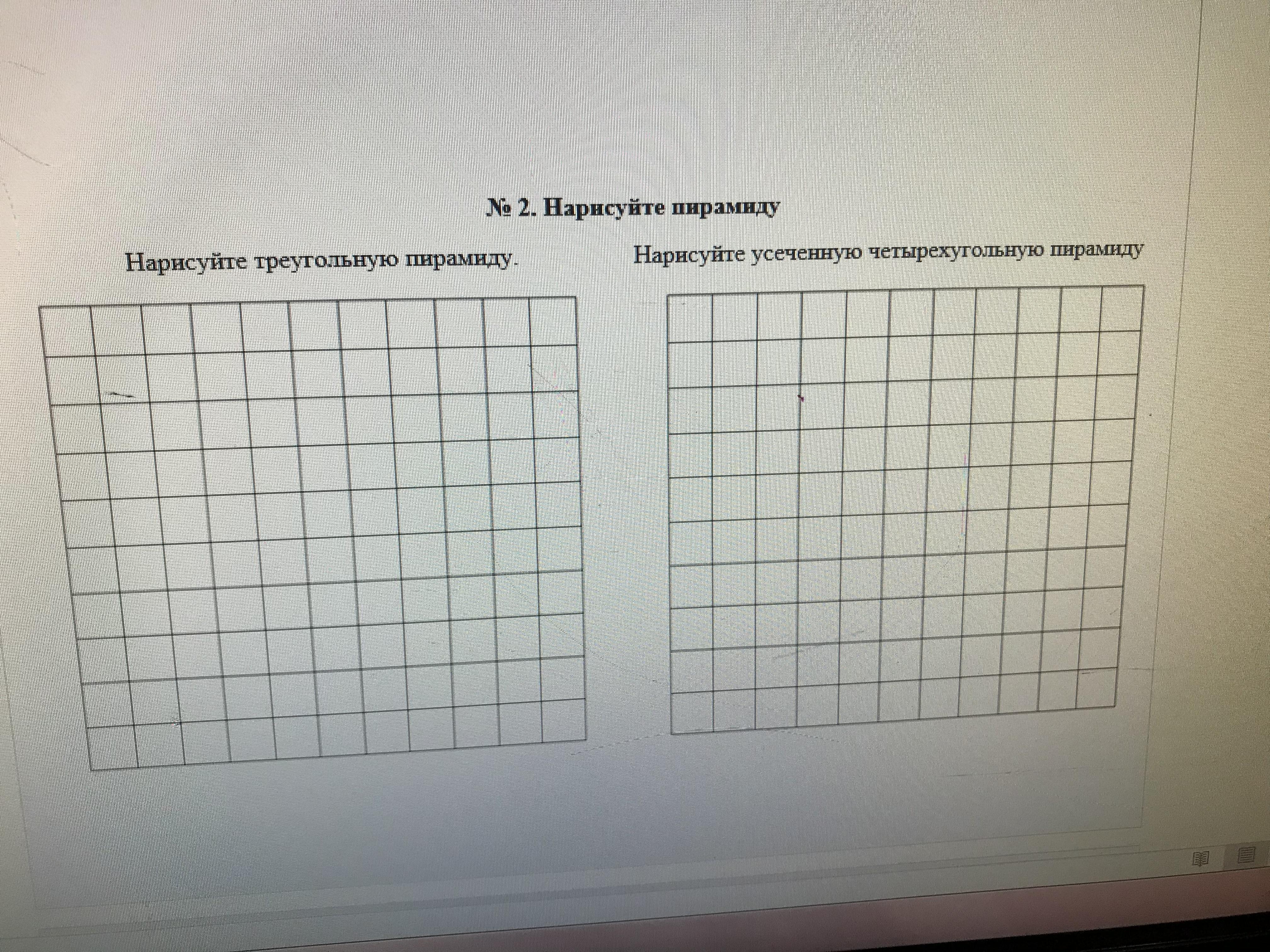 7. Треугольная пирамида, четырёхугольная пирамида, шестиугольная пирамида, усеченная четырёхугольная пирамида, пятиугольная.