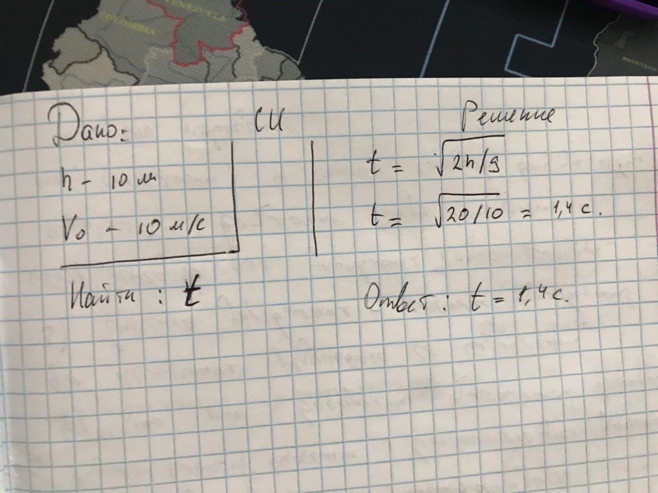 Решение t=V0/g=10м/c : 10м/с^2 = 1с