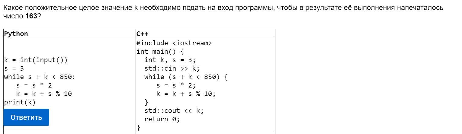 Какое положительное целое значение к необходимо подать на вход программы, чтобы в результате её выполнения напечаталось число 163?