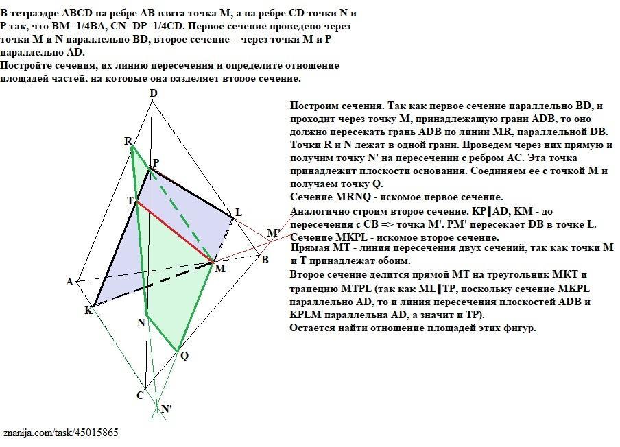 В тетраэдре ABCD на ребре AB взята точка M, а на ребре CD точки N и P так, что BM=1/4BA, CN=DP=1/4CD. Первое сечение проведено через точки M и N параллельно BD, второе сечение – через точки M и P параллельно AD.