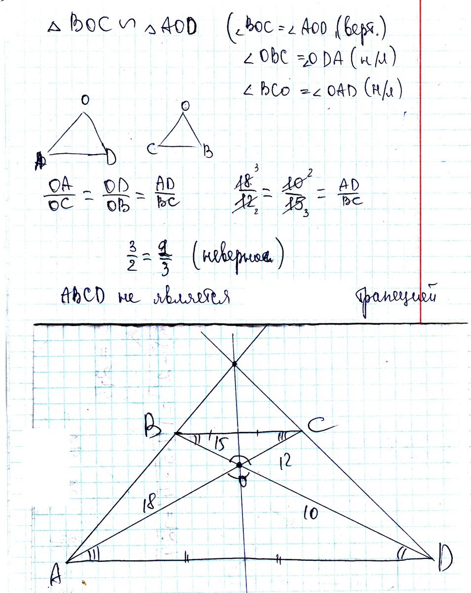 Диагонали CD четырехугольника ABCD пересекаются в точке O,AO=18 см,OB= 15 см,OC=12 см,OD=10 см.Доказать что ABCD - трапеция с основаниями AB и CD