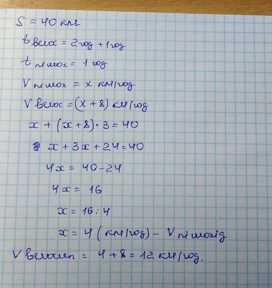 з пункту А в пункт В , відстань між якими 40 км виїхав велосипедист. Через 2 год після початку руху велосипедиста , в пункт А з пункту В вирушив пішохід Вони зустрілися через годину. знайти швидкість руху велосипедиста і пішохода якщо відомо що пішохід за 1 годину проходить на 8 км менше ніж велосипедист за 1 год.