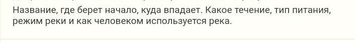 Волга;берёт начало на Валдайской возвышенности; впадает в Каспийское море; течение реки Волги среднее, меньше м/с .; питание Волги осуществляется снеговыми (60 % годового стока), грунтовыми (30 %) и дождевыми (10 %) водами; Естественный режим характеризуется весенним половодьем (апрель — июнь), малой водностью в период летней и зимней межени и осенними дождевыми паводками (октябрь); Транспортный путь, выработка эл. энергии на ГЭС, рыболовство, использование воды для промышленности, сельского и коммунального хозяйства