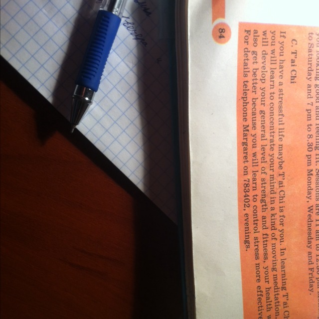 Если у теб напряженная жизнь, возможно Tai Chi для тебя. Во время учения Tai chi ты научишься кончентрировать свой разум, в своего рода медитации движения. Tai chi ,будт развивать твой общий* уровень силы, пригодности*, твоего здоровья...Также станет лучше, потому что ты научишься контролировать стресс более эффективно. Для подробносте звони Маргарет на (номер), по вечерам.