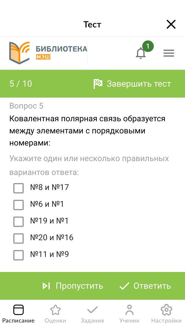 Ковалентная полярная связь образуется между элементами с порядковыми номерами: Укажите один или несколько правильных вариантов ответа: №8 и №17 №6 и №1 №19 и №1 №20 и №16 №11 и №9