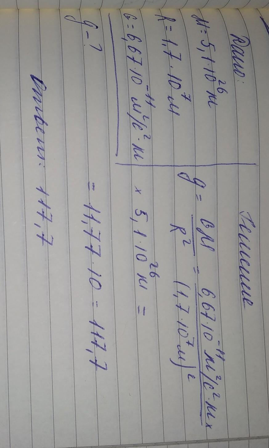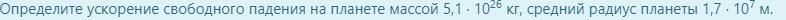 Определите ускорение свободного падения на планете массой 5,1 ∙ 1026 кг, средний радиус планеты 1,7 ∙ 107 м.