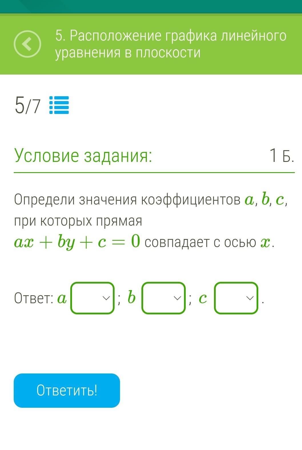 Определи значения коэффициентов a, b, c, при которых прямая ax+by+c=0 совпадает с осью x.