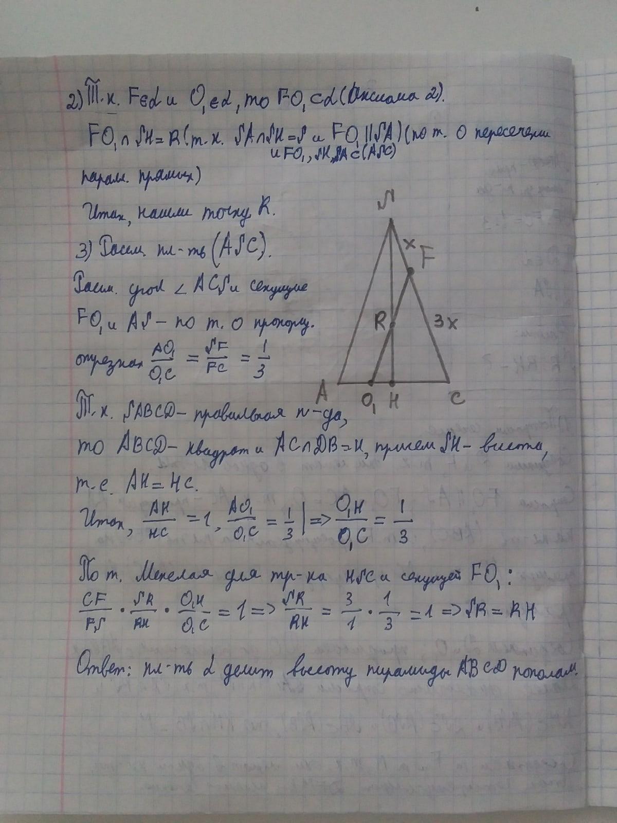 Постройте сечение правильной четырёхугольной пирамиды SABCD плоскостью α, проходящей через точки F и D параллельно SA, где F - точка на ребре SC, SF:FC=1:3. Определите, в каком отношении плоскость α делит высоту пирамиды.