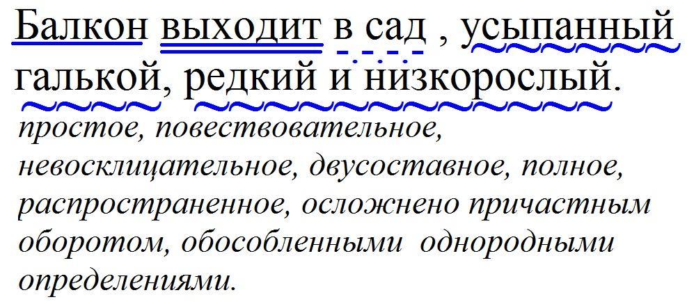 Синтаксический разбор предложения Балкон выходит в сад , усыпанный галькой, редкий и низкорослый