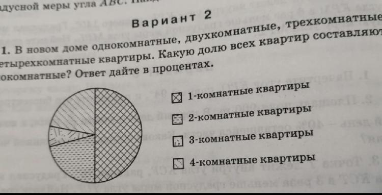Новом доме однокомнатные, двухкомнатные, трёхкомнатная, четырёх комнатные квартиры. Какую долю всех квартир составляет однокомнатная? Ответ дайте в процентах.