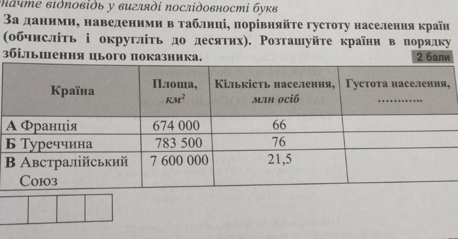 Объяснение:франція 66000000:674000=97,9 ос/км²