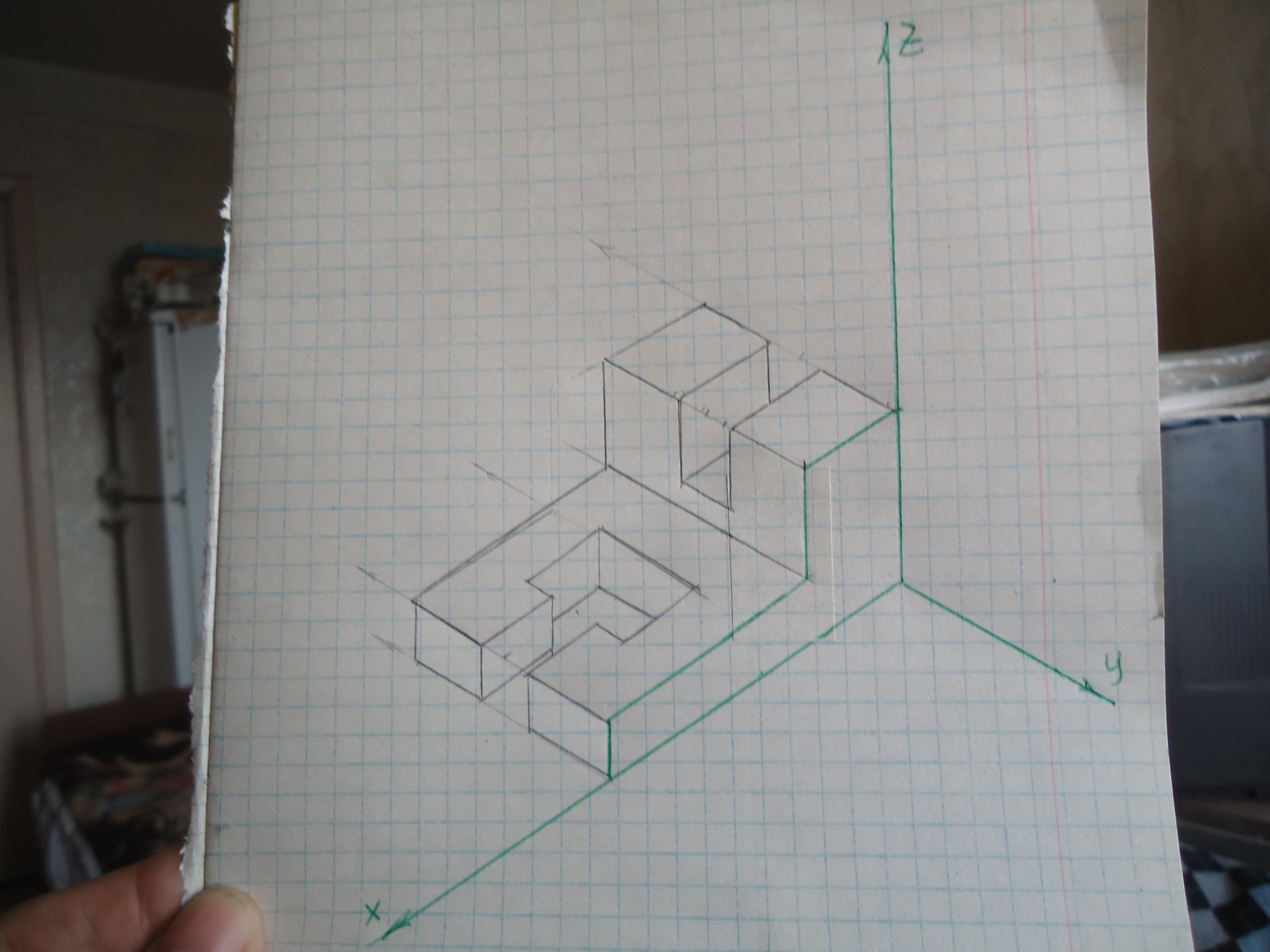 Начните построение с осей Х,У,Z, расположенных под углом 120°.