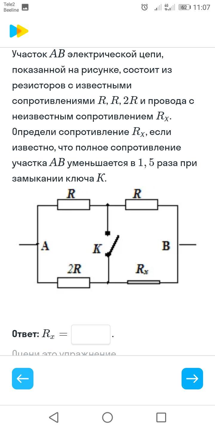 Участок AB электрической цепи показанной на рисунке состоит из резисторов с известными сопротивлениями r, r, 2r и проводами с неизвестным сопротивлением Rx. Определи сопротивление Rx, если известно что полное сопротивление участка AB уменьшается в 1,5 раза при замыкании ключа k.
