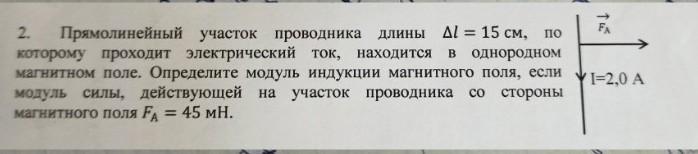 B = F/Δl*I*sin(α) = F/Δl*I (тк в данной задаче проводник перпендикулярен линиям индукции) = 45*10^{-3}/15*10^{-2}*2 = 0.15 Тл
