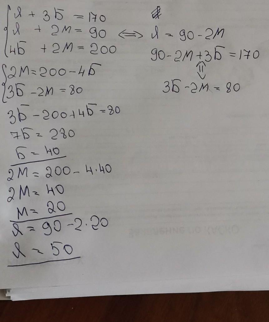 Яблоко и три бананы стоят 170. Яблоко и две морковки стоят 90. четыре бананы и две моркови стоят 200. Сколько стоит каждый из них