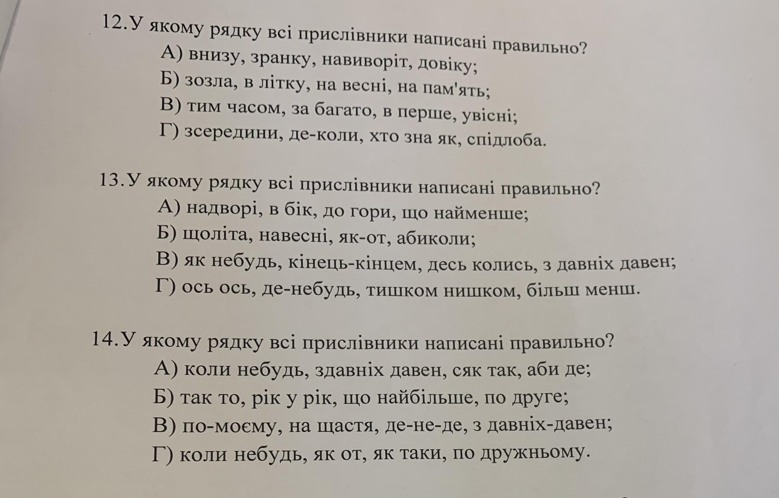 14. В) по-моєму, на щастя, де-не-де, з давніх-давен