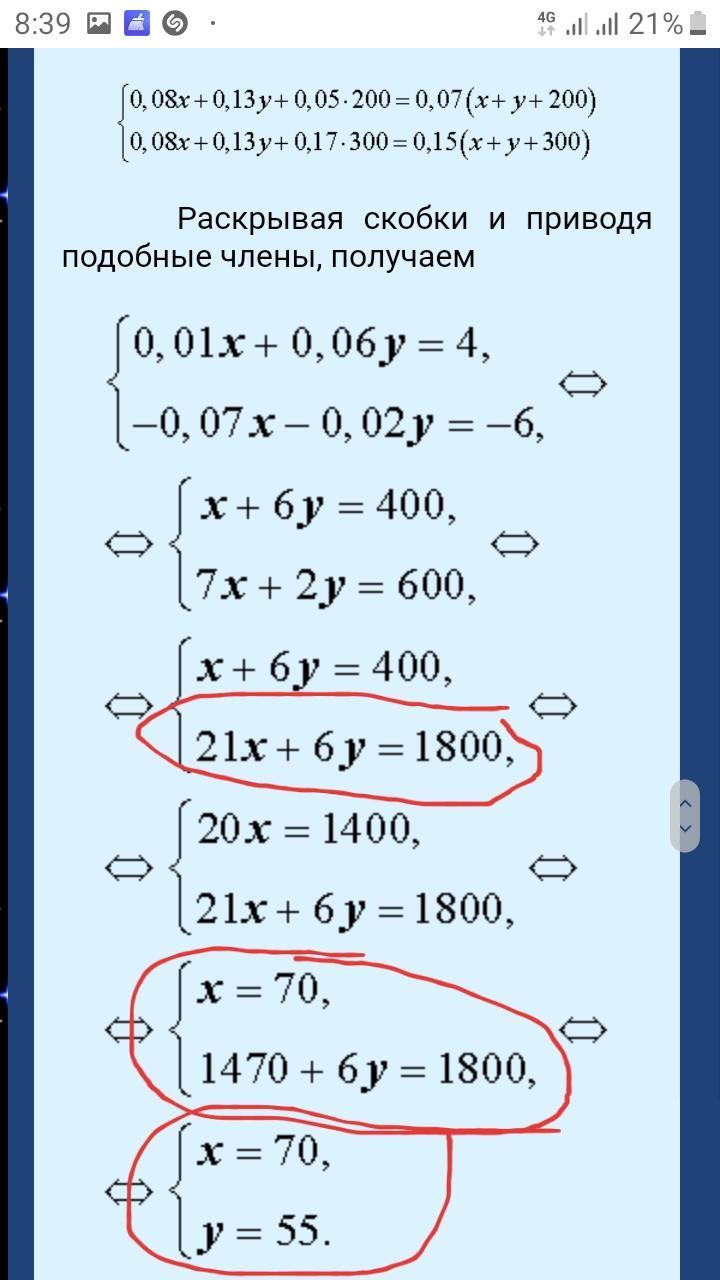 Потом этот х=70 поставляем в нижнее уравнение. Получается, что 21х+6у=1800 при постановке х равно 21*70+6у=1800