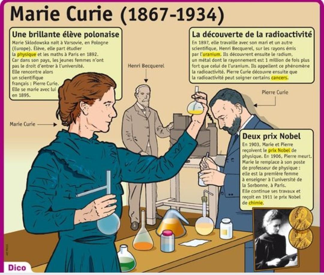 Marie Curie est une scientifique. Elle a découvert la radioactivité, grâce au radium. Elle a reçu deux prix Nobel pour ces travaux.