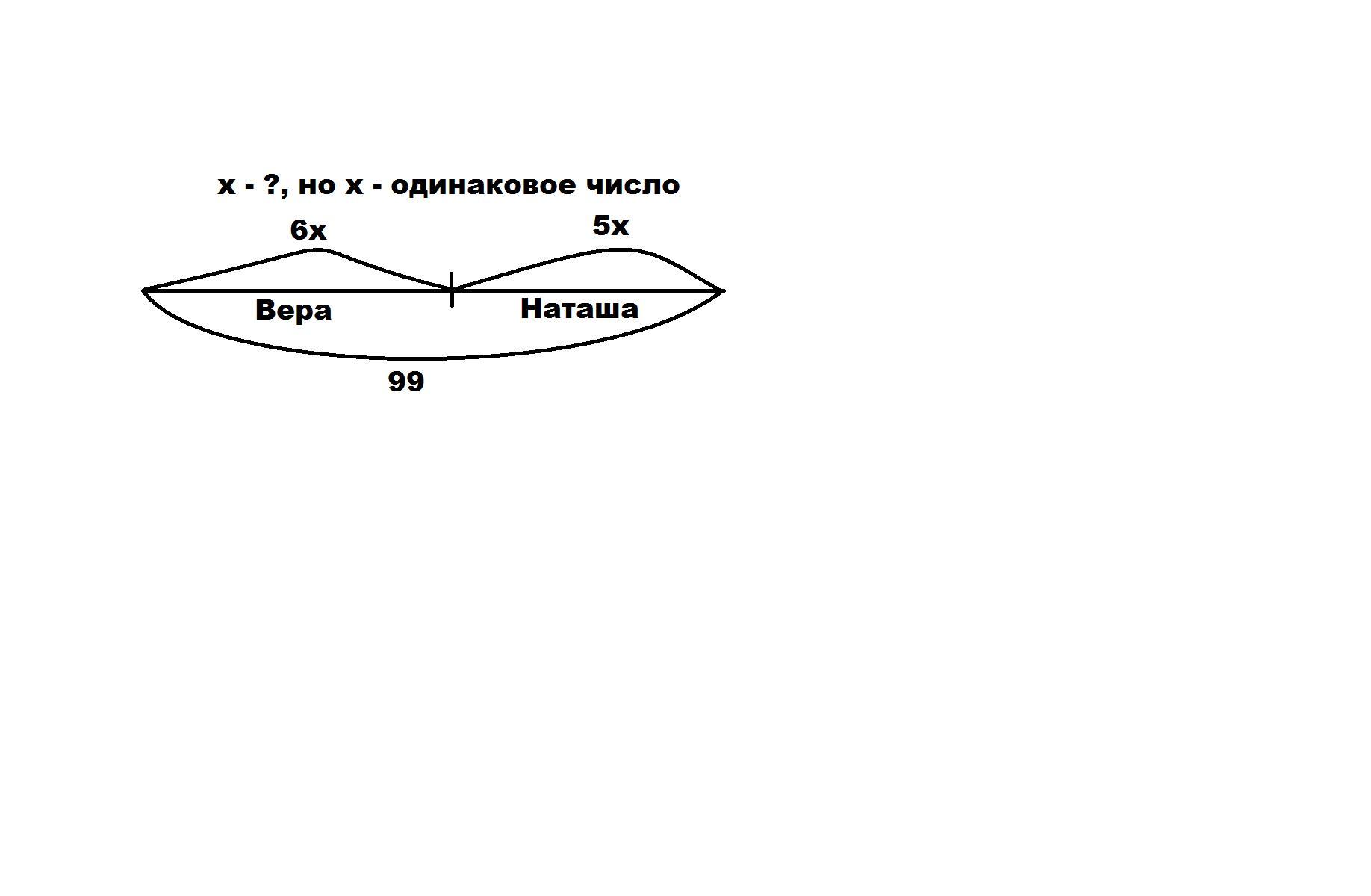 У двух девочек 99 вкладышей. На каждую страницу альбома Наташа наклеивает по 5 вкладышей, а вера – по 6 вкладышей. Сколько вкладышей в альбоме у каждой девочки, если количество страниц с вкладышами у них одинаково?