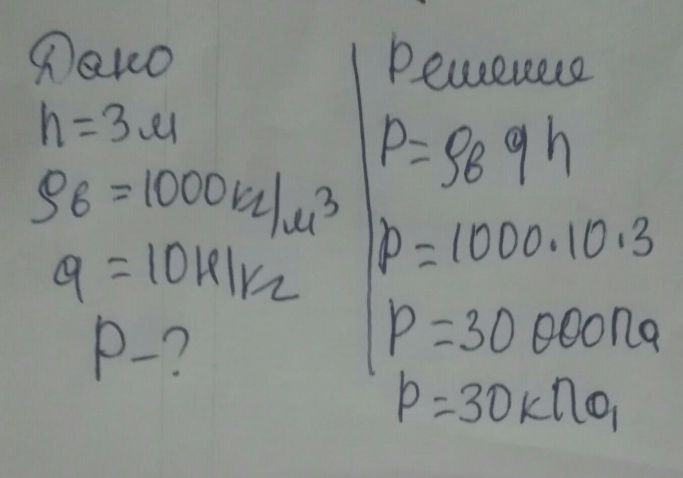 Сосуд высотой 3 м полностью заполнен водой. Определи давление воды на дно сосуда. Ответ выразите в кПа. Помогите пожалуйста!