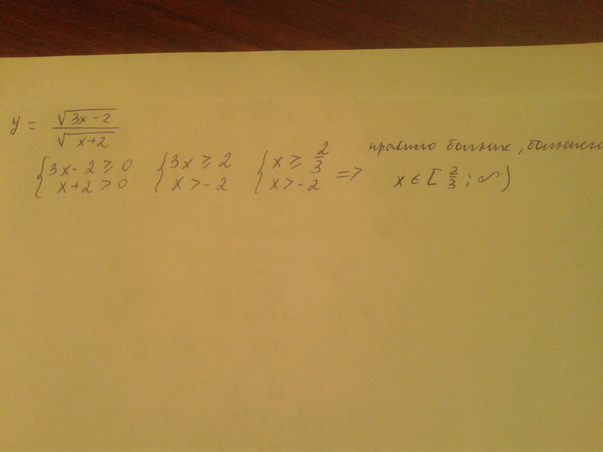 Найдите область определения функции у= числитель корень 3х-2 дробная черта и знаменатель корень х+2