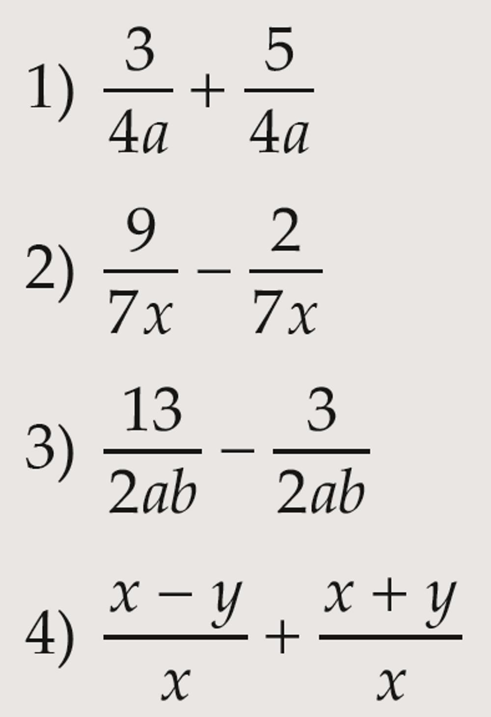 Во всех выражениях знаменатели у дробей одинаковые, просто складываем числители.