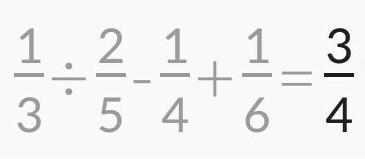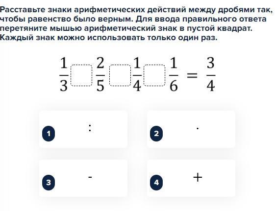 Расставьте знаки арифметических действий между дробями так, чтобы равенство было верным. Для ввода правильного ответа перетяните мышью арифметический знак в пустой квадрат. Каждый знак можно использовать только один раз.
