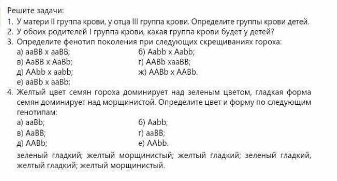4. Желтый цвет семян гороха доминирует над зеленым цветом, гладкая форма семян доминирует над морщинистой. Определите цвет и форму по следующим генотипам: