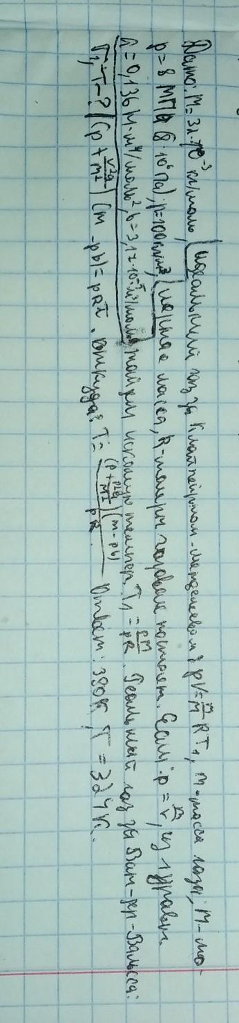 Давление р кислорода равно 8 МПа, его плотность р 100 кг/м³ . Опре- делите температуру газа, если: 1) газ идеальный (Т); 2) газ реальный (Т). По- правки Ван-дер-Ваальса а— 0.136 H- м⁴/моль² и b=3,17-10*^-5 м /моль.