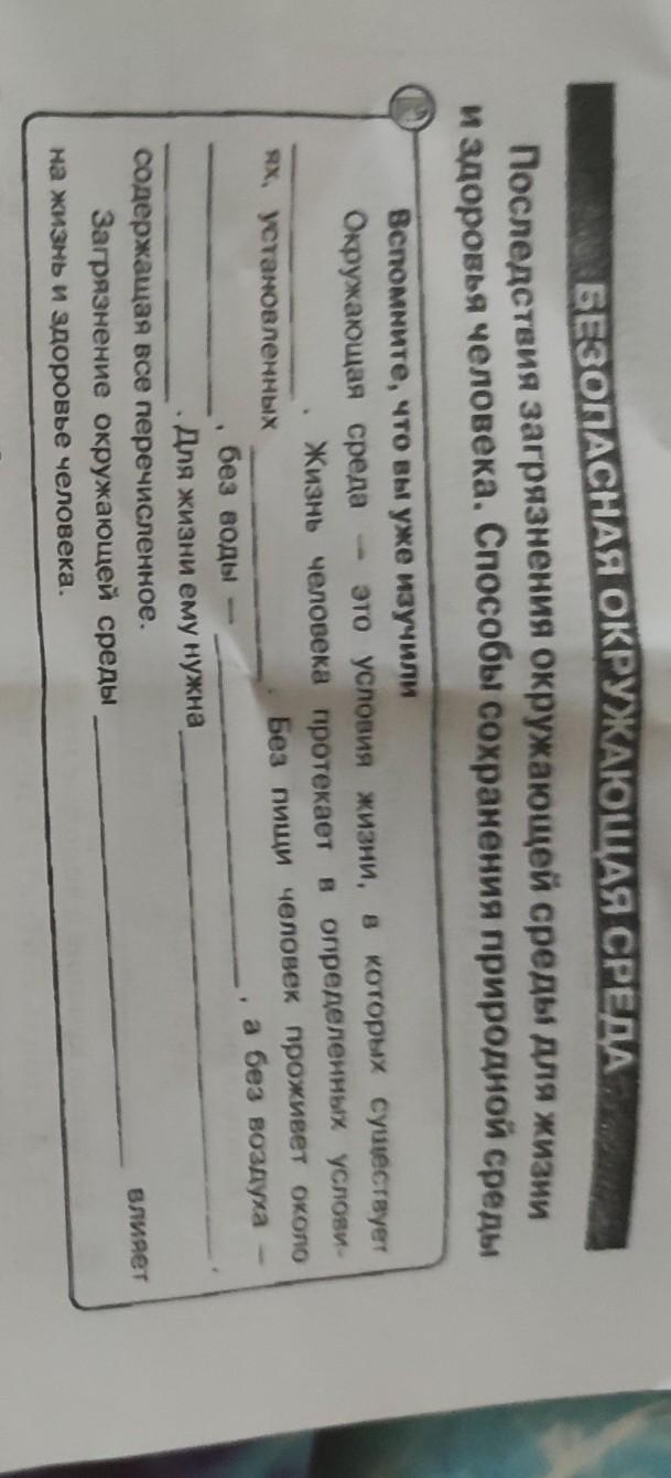 Окружающая среда - это условия жизни, в которых существует живой организм. Жизнь человека протекает в определённых условиях, установленных окружающей среды. Без пищи человек проживает около 2 недель, без воды - 2-3 дня, а без воздуха - 5 минут. Для жизни ему нужна вера в себя и жизнь.