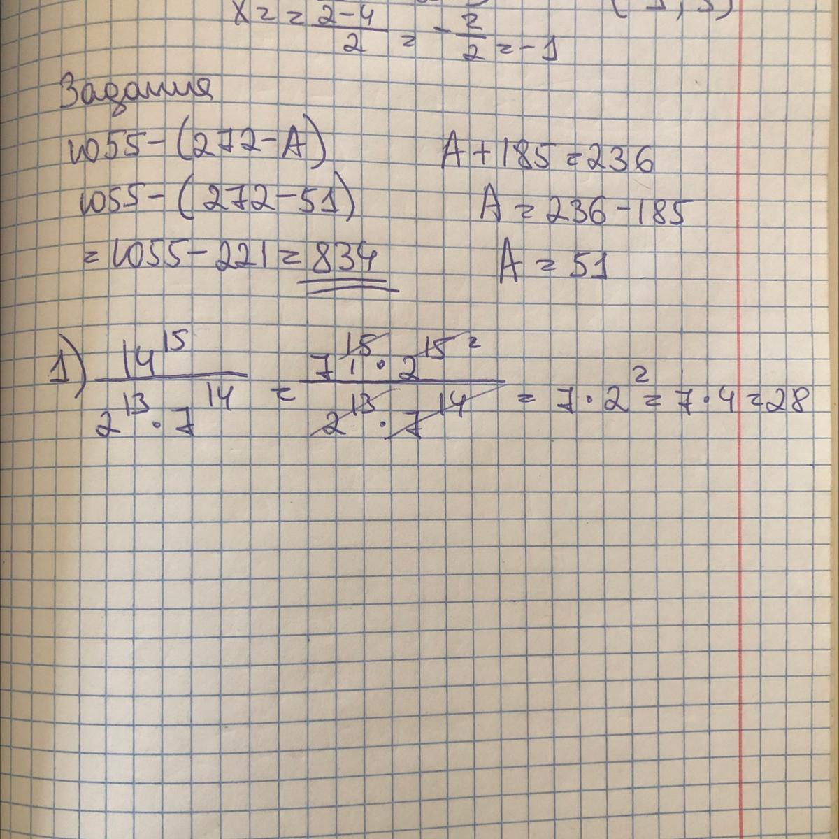 При делении мы показатели оставляем а степени вычитаем то 2^15-13*7^15-14 получаем 2^2*7^1=28
