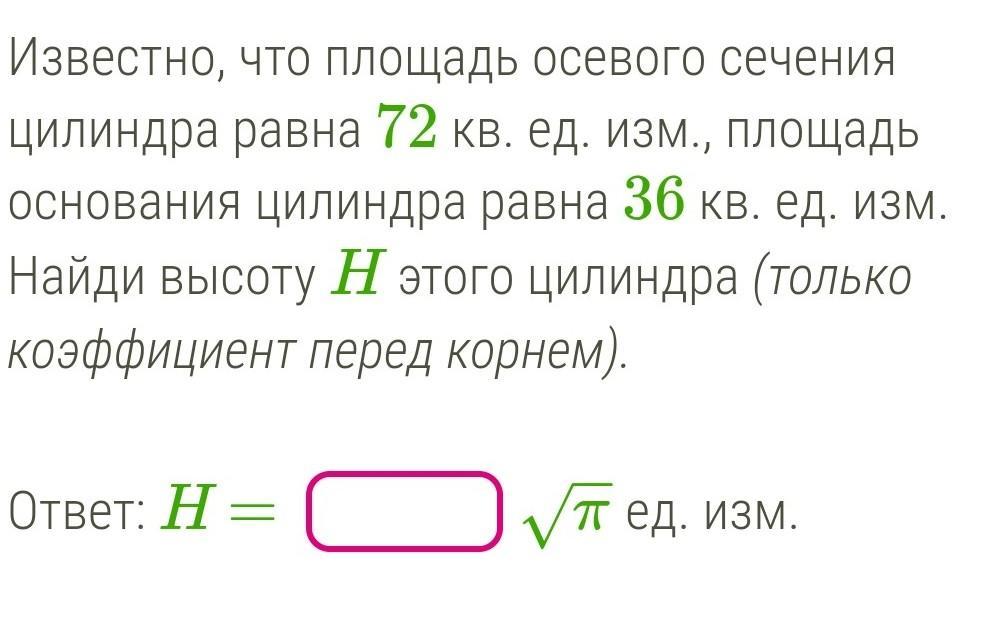 S пер = AB * H = 72 ; 12/√π * H = 72 ; H = 72√π/12 = 6√π ( од . ) .