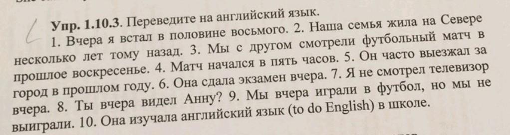 1. Yesterday I got up at half past seven. 2 Our family lived in the north a few years ago. My friend and I watched a soccer game last Sunday. 4. The match began at five o'clock. 5. He often traveled out of town last year. 6. She passed the exam yesterday. 7. I didn't watch TV yesterday. eight. 8. Did you see Anna yesterday? 9. We played football yesterday, but we didn't win. 10. She studied English at school.