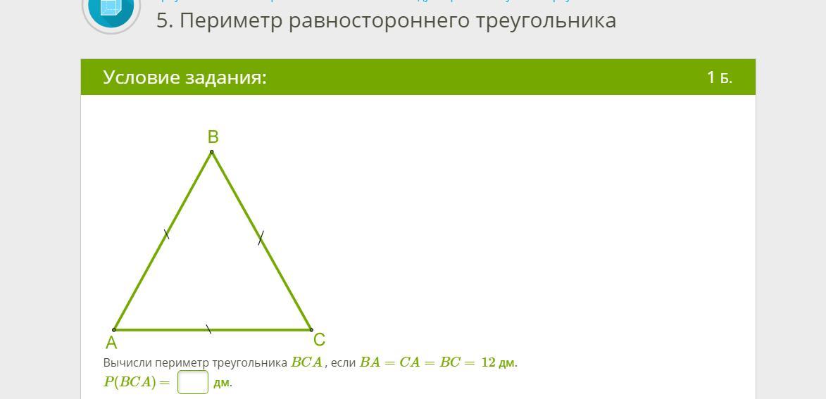 P = AB + BC + AC = 12 + 12 + 12 = 36 дм