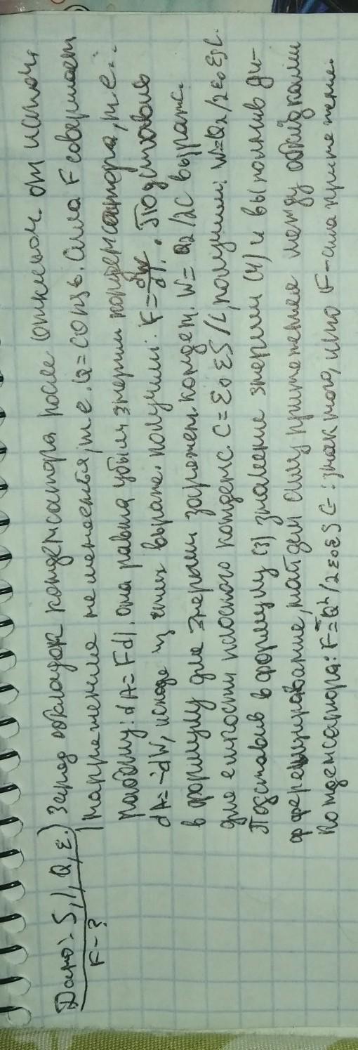 Даю сотку , только помогите!!! Плоскому конденсатору с площадью обкладок S и расстоянием между ними l сообщен заряд Q, после чего конденсатор отключен от источника напря- жения. Определите силу притяжения F между обкладками конденсатора, если диэлектрическая проницаемость среды между обкладками равна є.