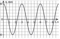На графике показано отклонение во времени отклонения маятника от состояния равновесия. Сколько миллиметров составляет амплитуда колебаний?