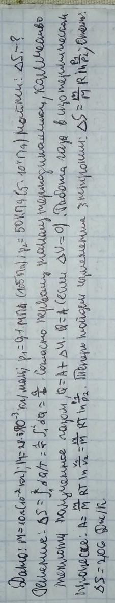 ΔS = (0,010/0,028)·8,31·ln(100 000 / 50 000) ≈ 2,1 Дж/К